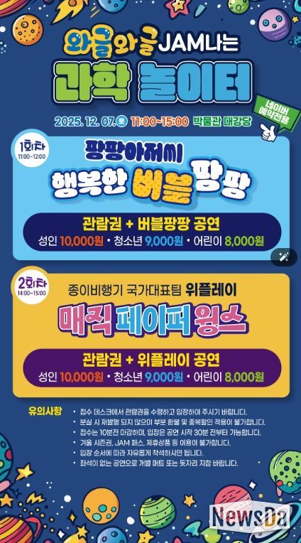 뉴스다 최광묵 기자 | 제주국제자유도시개발센터(이사장 직무대행 곽진규, JDC)에서 운영하는 제주항공우주박물관에서는 오는 12월 7일 과학과 문화가 융복합된‘와글와글 JAM나는 놀이터’를 개최할 예정이다.