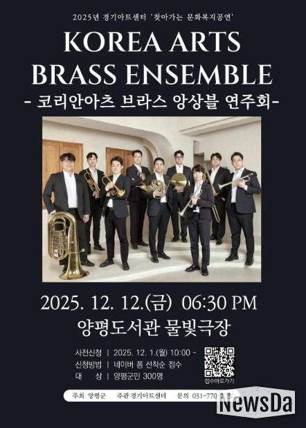 뉴스다 최광묵 기자 | 양평군은 지역 주민에게 품격 있는 문화 향유 기회를 제공하고자 오는 12월 12일 양평도서관 물빛극장에서 ‘연말 맞이 찾아가는 문화복지 공연’을 개최한다고 밝혔다.