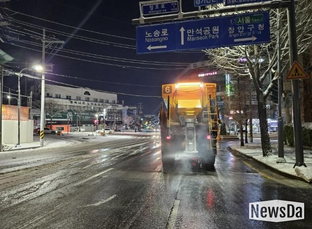 뉴스다 최광묵 기자 | 4일 오후 1시부터 제설 비상근무 체계에 돌입했던 수원시(시장 이재준)가 제설 장비와 인력을 투입해 제설 작업에 총력을 기울이고 있다.