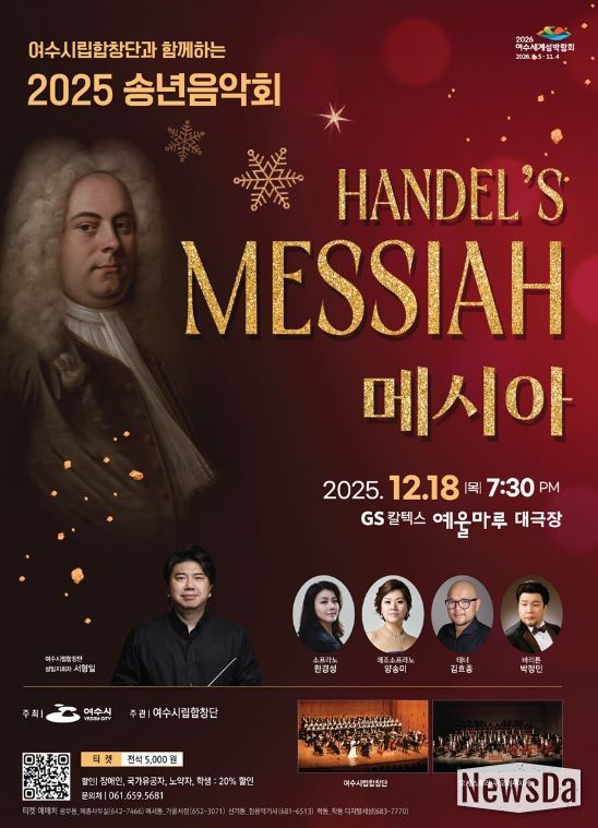 서형일 상임지휘자는 "메시아는 종교를 초월해 인간의 고난과 희망, 구원이라는 보편적 메시지를 담은 작품"이라며 "여수시립합창단의 정제되고 풍부한 사운드와 최정상급 솔리스트, 오케스트라가 만들어낼 감동의 하모니로 시민 여러분께 따뜻한 위로와 축복을 전하겠다"고 말했다.