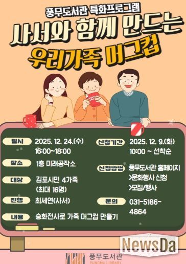 뉴스다 최광묵 기자 | 김포시 풍무도서관에서 연말을 맞이하여 ‘사서와 함께 만드는 우리가족 머그컵’을 오는 12월 24일 오후 4시부터 6시까지 운영한다.