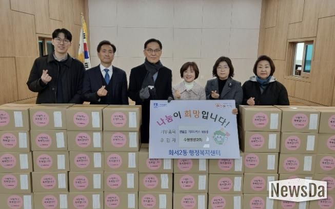 뉴스다 최광묵 기자 | 수원시 팔달구 화서2동은 지난 9일, 연말을 맞아 관내 취약계층의 생활 안정을 돕기 위해 수원영광교회가 마련한 생필품 기프트박스 100상자 전달식을 진행했다고 밝혔다. 이번 후원은 갑작스러운 한파로 동절기 어려움을 겪는 이웃들이 조금이나마 따뜻한 겨울을 보낼 수 있도록 하자는 취지에서 마련됐다.