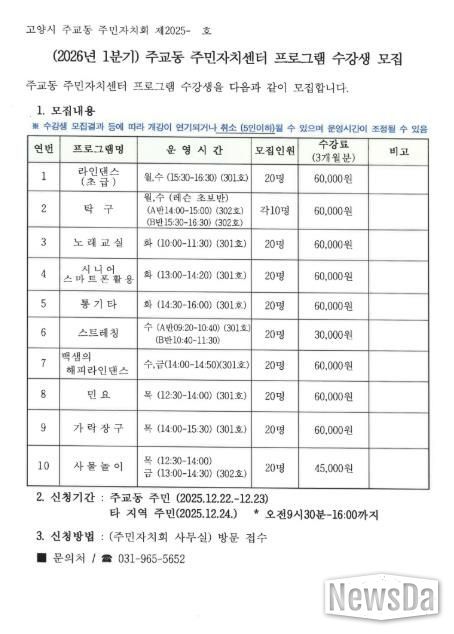 뉴스다 최광묵 기자 | 고양특례시 덕양구 주교동 주민자치회는 오는 12월 22일부터 24일까지 2026년 1분기 주민자치센터 문화강좌 프로그램 수강생을 모집한다.
