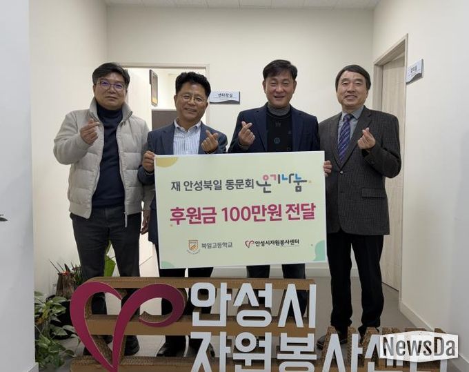 뉴스다 최광묵 기자 | 지난 8일, 안성시자원봉사센터는 연말을 맞아 재 안성북일 동문회로부터 온기나눔 후원금 100만 원을 전달받았다.