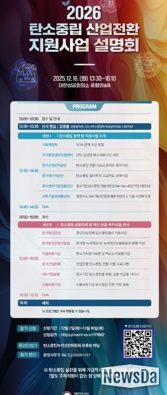 뉴스다 최광묵 기자 | 대통령 직속 2050 탄소중립녹색성장위원회는 12월 16일 대한상공회의소에서 관계 부처 및 유관기관 합동으로 ‘2026 탄소중립 산업전환 지원사업 설명회’를 개최한다.