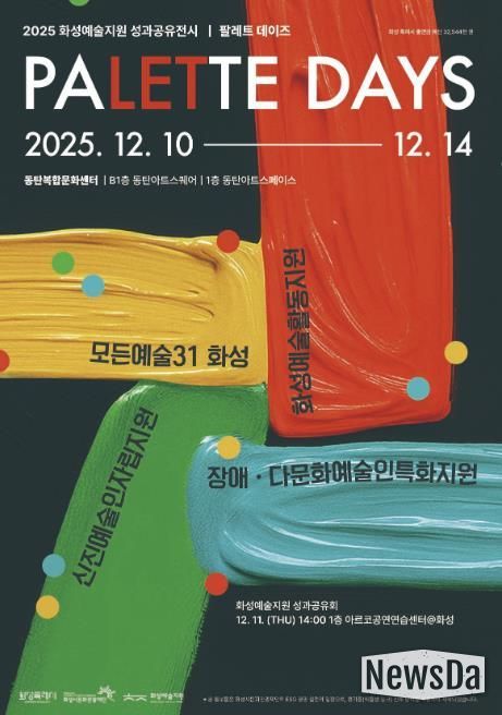 뉴스다 최광묵 기자 | (재)화성시문화관광재단은 12월 10일부터 14일까지 동탄복합문화센터(동탄아트스퀘어·동탄아트스페이스·아르코공연연습센터 화성)에서 ‘2025 화성예술지원 성과공유 주간 'Palette Days'’ 행사를 진행한다.