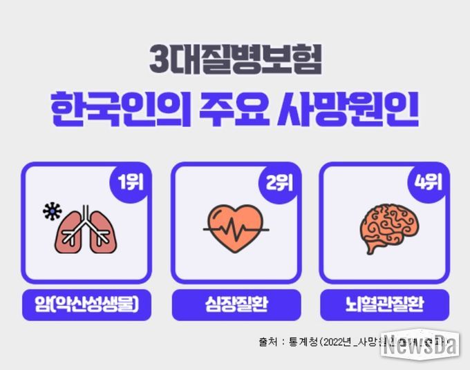 뉴스다 최광묵 기자 | 흔히 3대질병이라 일컫는 암, 심혈관질환, 뇌혈관질환은 통계청 발표자료에 따르면 한국인의 주요 사망원인 중에서 3위 폐렴을 제외하고 1~4위를 차지하고 있으며, 이전부터 지금까지도 살면서 가장 먼저 대비해야 하는 치명적인 질병으로 강조되고 있다. 이러한 중대질병에 대비하기 위하여 상기 세가지 치명적인 질병을 집중보장하는 3대질병진단비보험을 많이 가입하고 있다. 3대진단비보험은 각각의 질병을 중점적으로 보장하면서도 가입자 특성에 맞는 특약을 추가함으로써 종합건강보험으로도 활용할 수가 있다.