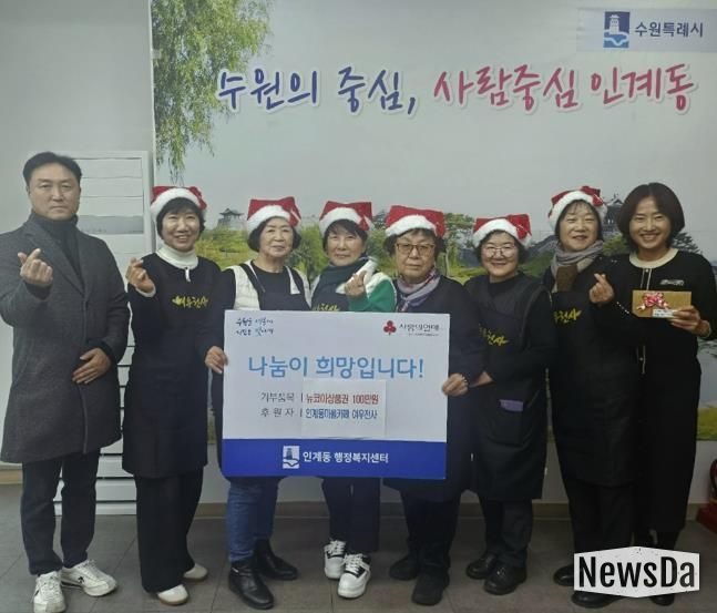 뉴스다 최광묵 기자 | 지난 12월 15일, 수원시 팔달구 인계동은 마을 카페 ‘여우천사’에서 동 행정복지센터에 뉴코아상품권(총 100만 원 상당)을 기탁했다고 밝혔다.