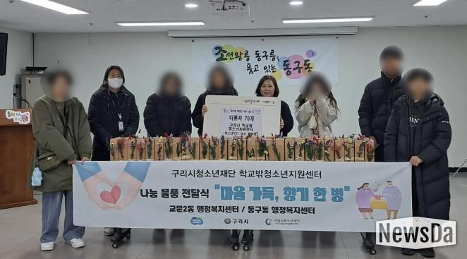 뉴스다 최광묵 기자 | 구리시청소년재단 학교밖청소년지원센터는 지난 12월 15일, 학교 밖 청소년들과 함께 교문2동과 동구동 행정복지센터를 방문해 지역 내 홀로 어르신들을 위한 나눔 물품(디퓨저) 100개를 전달했다고 밝혔다.