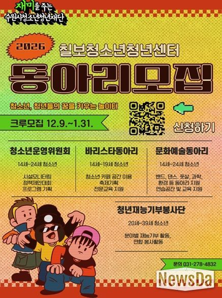 뉴스다 최광묵 기자 | 수원시청소년청년재단 칠보청소년청년센터는 2025년 12월 9일부터 2026년 1월 31일까지 지역 청소년과 청년들의 다양한 성장 활동을 지원하기 위한 2026년 자치기구 및 동아리 모집을 진행한다. 이번 모집은 문화·예술·진로탐색·정책참여 등 청소년과 청년의 주체적 활동을 활성화하고, 지역사회 참여 기회를 넓히기 위해 마련됐다.