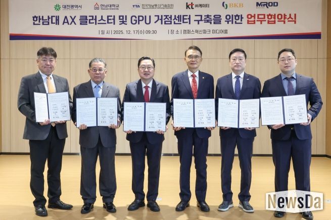 뉴스다 최광묵 기자 | 대전시는 17일 한남대학교, 한국정보통신기술협회(TTA), ㈜KT, 비케이비에너지(주), ㈜엠아르오디펜스와‘한남대 AX 클러스터 및 고성능 AI GPU 거점센터’ 구축을 위한 업무협약을 체결했다.