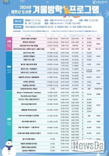 뉴스다 최광묵 기자 | 이천시는 2026년 1월부터 2월까지 겨울방학 기간에 어린이를 대상으로 한 다양한 독서문화 프로그램을 운영한다고 밝혔다.