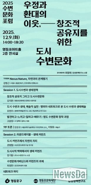 뉴스다 최광묵 기자 | 영등포문화재단은 지난 12월 9일 영등포문화재단 2층 전시실에서 ‘2025 도시수변문화 포럼’을 개최했다. 이번 포럼은 문화도시 영등포 4년 차 사업의 성과를 점검하고, 도시수변문화의 다음 단계 전략을 모색하기 위해 마련된 자리로, 문화예술 관계자와 시민 등 50여 명이 참석해 성황리에 진행됐다.