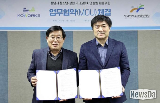 뉴스다 최광묵 기자 | 성남시청소년청년재단은 12월 17일, 주식회사 코웍스와 성남시 청소년·청년 대상 국제교류 활동 콘텐츠의 질적 향상과 교육 사업 발전을 위한 업무협약을 체결했다.