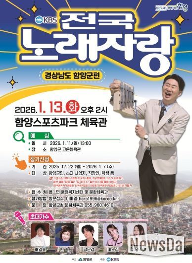 뉴스다 최광묵 기자 | 대한민국 대표 전국민 참여 노래 경연 프로그램인 ‘KBS 전국노래자랑’ 함양군편이 함양스포츠파크체육관 준공을 기념해 2026년 1월 13일, 새롭게 준공된 함양스포츠파크체육관에서 개최된다.
