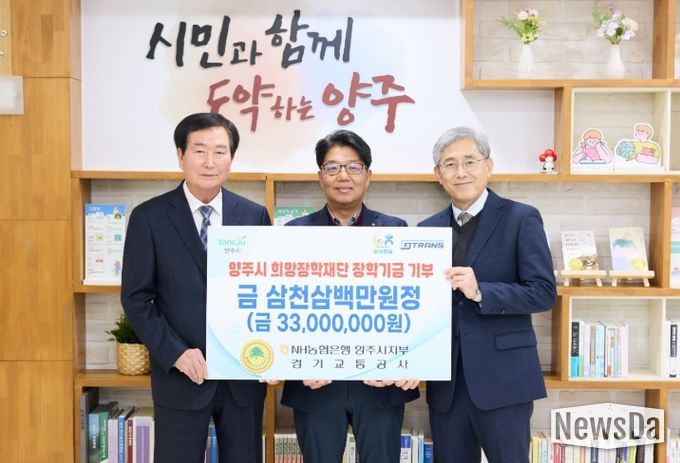 뉴스다 최광묵 기자 | NH농협은행 양주시지부·경기교통공사는 12월 17일 양주시청에서 (재)양주시희망장학재단에 인재 양성과 교육 발전을 위한 장학기금 3천3백만원을 기부했다.