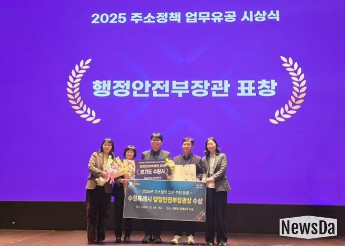 뉴스다 최광묵 기자 | 수원특례시가 행정안전부 주관 ‘2025 주소정책 워크숍’에서 ‘2025 주소정책 업무 분야 우수기관’으로 선정돼 행정안전부 장관 표창을 받았다. 특별교부세 4000만 원도 확보했다.