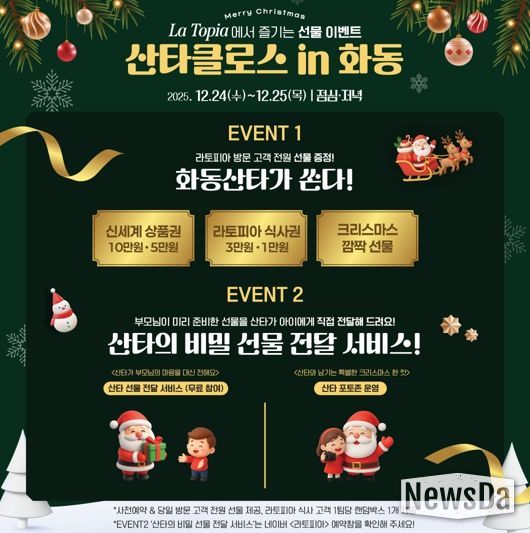 ‘화동 산타가 쏜다’는 라토피아 식사 고객 전원에게 랜덤 박스를 증정하는 깜짝 이벤트다. 무엇이 나올지 모르는 설렘이 크리스마스의 재미를 더한다. 아이들을 위한 특별한 순간도 마련됐다. 부모가 미리 준비한 선물을 산타가 직접 전달하는 산타의 비밀 선물 전달 이벤트다. 산타를 만난 아이들의 웃음이 공간을 가득 채울 예정이다.
