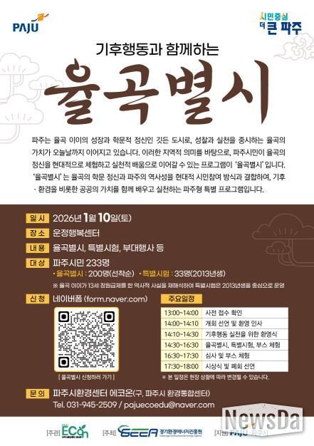 뉴스다 최광묵 기자 | 파주시환경센터 ‘에코온’은 파주를 대표하는 조선시대 사상가 율곡 이이의 학문 정신을 현대적 기후행동 가치로 재해석한 기후문화축제 ‘기후행동과 함께하는 율곡별시’를 오는 내년 1월 10일 운정행복센터에서 개최한다.