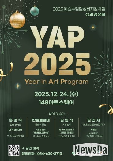 뉴스다 최광묵 기자 | (재)영주문화관광재단은 오는 12월 24일 148아트스퀘어에서 크리스마스 컨셉의 ‘2025 예술누림활성화 지원사업 성과공유회 'YAP 2025'’를 개최할 예정이다.