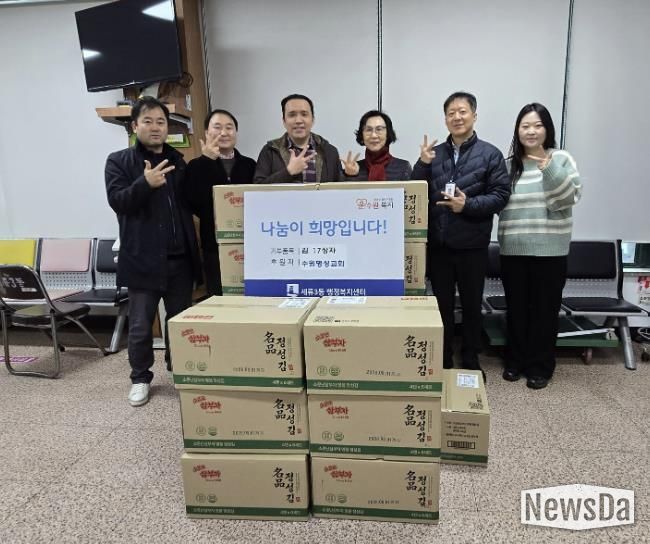 뉴스다 최광묵 기자 | 수원명성교회는 지난 19일 수원시 권선구 세류3동 행정복지센터에 김 17 상자를 전달하며 취약계층을 위한 나눔을 실천했다고 밝혔다. 전달된 김은 관내 저소득 가구와 도움이 필요한 이웃들에게 배부될 예정이다.