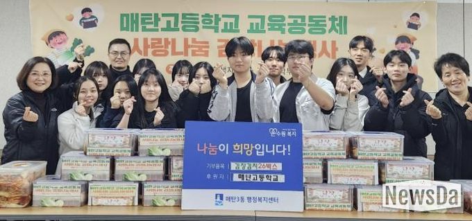 뉴스다 최광묵 기자 | 매탄고등학교는 지난 19일, 교사·학생·학부모가 함께 참여해 마련한 김장김치 26박스를 매탄3동행정복지센터에 전달하며 지역사회에 따뜻한 나눔을 실천했다.