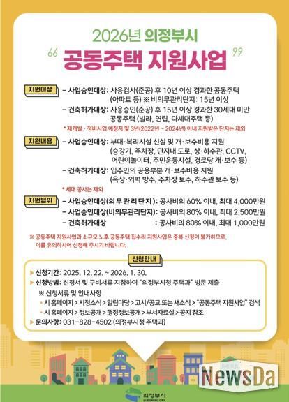 뉴스다 최광묵 기자 | 의정부시는 노후 공동주택의 관리비용 부담 완화와 주거환경 개선을 위해 내년 1월 30일까지 ‘2026년 공동주택 지원사업’ 신청을 받는다.