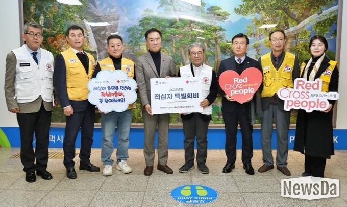 뉴스다 최광묵 기자 | 평택시는 지난 19일 평택시청 대외협력실에서 '2026년도 대한적십자사 특별회비 전달식’을 열고, 정장선 시장이 이재정 대한적십자사 경기도지사회장에게 적십자 특별회비를 전달하며 인도주의 나눔 실천에 동참했다.