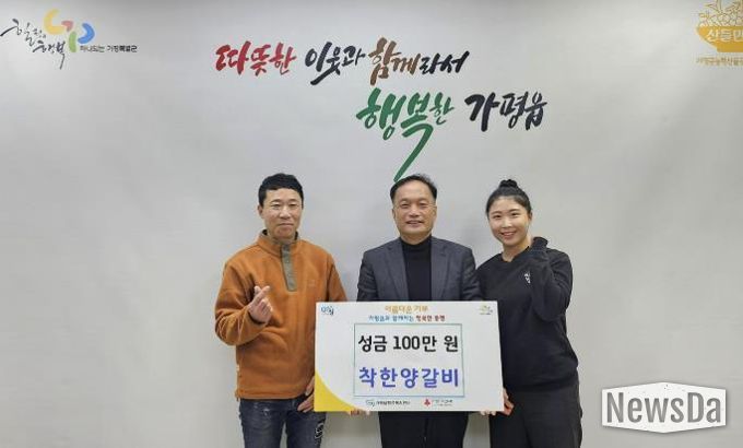 뉴스다 최광묵 기자 | 가평군 가평읍 경춘로 소재 착한양갈비는 지난 19일 행정복지센터를 방문해 이웃돕기 성금 100만 원을 기탁했다.