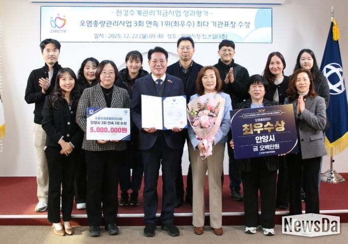 뉴스다 최광묵 기자 | 안양시는 한강유역환경청 주관 ‘2024 회계연도 한강수계관리기금사업 성과평가’에서 한강수계 관리청 34곳 중 오염총량관리사업 분야에서 3회 연속 1위(최우수)를 달성했다고 22일 밝혔다.