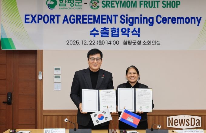 22일 함평군은, 캄보디아 현지 유통업체 SREYMOM FRUIT SHOP(이하 슬레이맘)과 이날 함평군청에서 샤인머스캣·딸기·태추단감 등 30만 불 규모의 농특산물 수출 확대 협약을 체결했다.