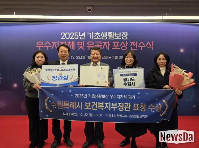 뉴스다 최광묵 기자 | 수원특례시가 보건복지부 주관 ‘2025년 기초생활보장·긴급지원 사업’ 평가에서 우수 지자체로 선정돼 보건복지부 장관 표창을 받았다. 시상식은 22일 서울 글래드호텔에서 열렸다.