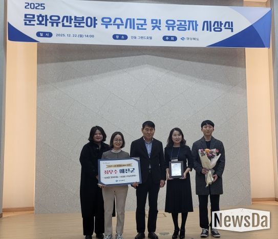 뉴스다 최광묵 기자 | 예천군은 22일 안동 그랜드호텔에서 열린 경북도 주관 ‘2025년 시군 문화유산분야 평가’에서 최우수상을 수상하는 쾌거를 이루었다. 지난 2023년 최우수상, 2024년 특별상에 이어 2025년 최우수상까지 3년 연속 수상으로 문화유산 보존·관리·활용 분야에서 높이 평가받고 있다.