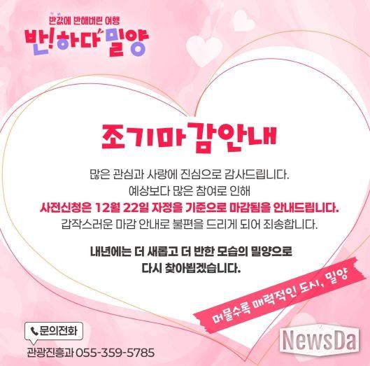 뉴스다 최광묵 기자 | 경남 밀양시는 ‘반하다밀양 반값여행’ 환급(페이백) 행사 사전 신청을 22일 자정 기준으로 조기 마감한다고 전했다. 크리스마스와 연말 연초를 앞두고 신청이 급증하면서 잔여 예산이 예상보다 빠르게 소진될 것으로 판단돼 접수 종료를 결정했다는 설명이다.