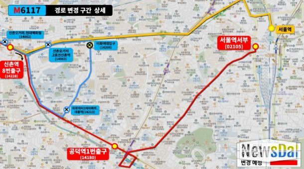 이번 운행경로 변경으로 기존 신촌오거리.현대백화점(중), 신촌오거리.2호선신촌역, 이화여대입구, 마포자이2차아파트.대흥역 정류소은 미정차하고, 신촌역8번출구(14228), 공덕역1번출구(14180), 서울역서부(02105) 정류소에 정차하게 된다.