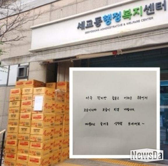 23일 오전, 세교동 행정복지센터 입구에는 이름을 밝히지 않은 기부자가 남기고 간 메모와 라면 100상자가 놓여 있었다.