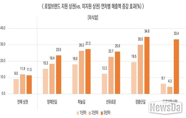 이러한 이미지 개선은 실제 소비 증가로 이어지는 ‘상권 브랜딩의 파도 효과’를 만들어냈다. ‘소비 반응’ 단계에서 지원 상권과 미지원 상권(로컬브랜드 사업에 신청했지만, 선정되지 않은 상권)을 비교 분석한 결과, 5개 상권 모두에서 외식업을 중심으로 매출 증가 효과가 뚜렷하게 나타났다. 특히 외식업 매출은 모든 상권에서 약 14%에서 최대 29%까지 상승하며, 상권 브랜딩과 체험 콘텐츠 확충이 실제 지역 경제 활성화로 이어짐을 수치로 증명했다.