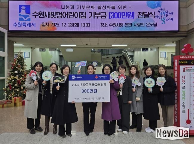 뉴스다 최광묵 기자 | 수원새빛형어린이집협의회가 “어려움을 겪는 이웃에게 전달해달라”며 수원시에 300만 원을 기부했다. 전달식은 23일 수원시청 본관 사랑의 온도탑 앞에서 열렸다.