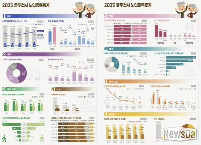 이번 통계는 경인지방통계청과의 업무협약을 통해 인구·가구·인구 이동·주택·건강·복지·소득·일자리·안전 등 9개 핵심 분야, 총 82개 항목을 대상으로 행정자료와 기존 통계자료를 연계·결합해 세밀하게 구성했다. 조사 대상은 2024년 기준 동두천시에 주민등록이 된 만 65세 이상 노인이다.