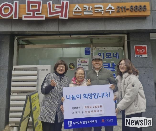 최영문 우만2동장은 “경기가 좋지 않음에도 해마다 후원을 이어오는 것이 결코 쉬운 일이 아니다”라며 “이모네칼국수의 따뜻한 나눔이 지역사회에 큰 울림을 주고 있으며, 홀몸어르신 복지 향상에 실질적인 도움이 되고 있다”고 감사의 뜻을 밝혔다.