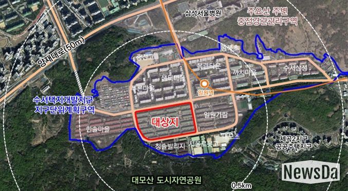 상록수아파트는 1993년에 준공된 대모산 자락에 위치한 노후단지로, 이번 정비계획을 통해 용도지역이 제2종일반주거지역(7층이하)에서 제2종일반주거지역으로 변경되고, 최고 25층 공동주택 1,126세대 규모(임대 74세대 포함)의 자연경관과 어우러지는 주거단지로 조성된다.
