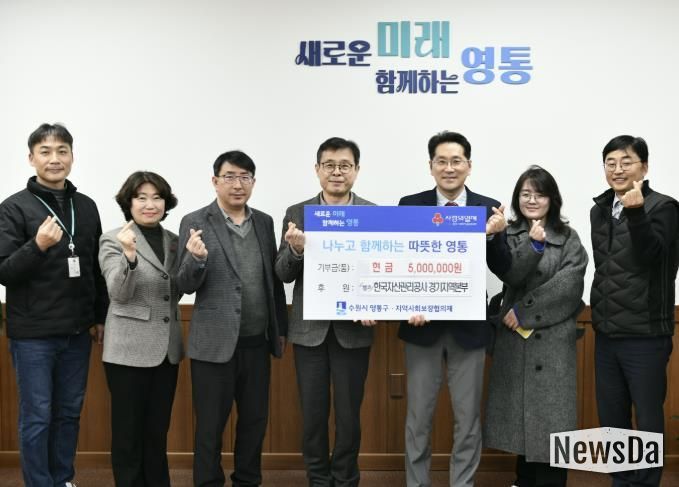 뉴스다 최광묵 기자 | 수원시 영통구는 지난 24일 한국자산관리공사 경기지역본부에서 관내 경제적으로 어려움을 겪는 이웃을 위해 성금 500만 원을 기부했다고 밝혔다.