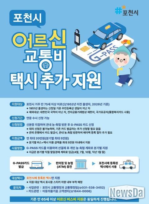 뉴스다 최광묵 기자 | 포천시는 2026년부터 포천시에 거주하는 만 75세 이상 어르신을 대상으로 ‘포천시 만 65세 이상 어르신 교통비 지원사업’에 택시 이용을 추가 지원한다.