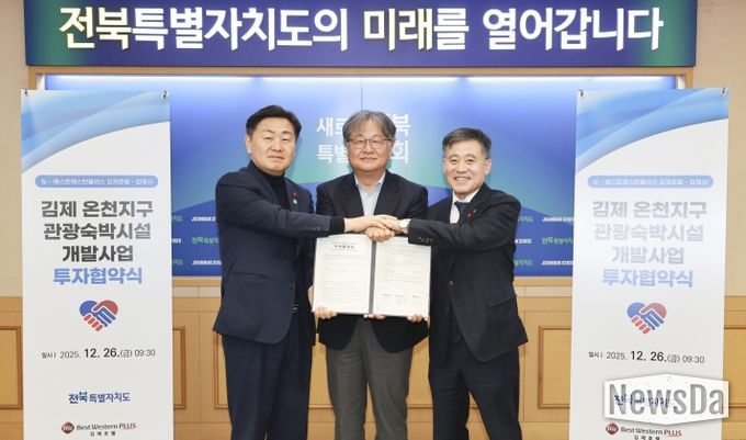 뉴스다 최광묵 기자 | 전북특별자치도가 26일 도청 회의실에서 김제시, 베스트웨스턴플러스 김제호텔과 김제 온천지구 관광숙박시설 개발사업 투자협약(MOU)을 체결했다.