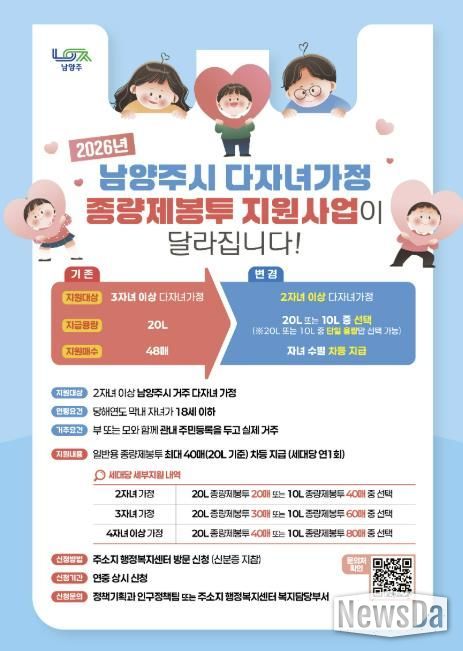 뉴스다 최광묵 기자 | 남양주시는 내년 1월부터 ‘다자녀가정 종량제봉투 지원사업’ 대상을 2자녀 이상 가정으로 확대 운영한다고 26일 밝혔다.