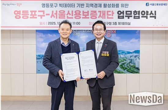 뉴스다 최광묵 기자 | 서울신용보증재단과 영등포구는 지난 12월 17일 영등포구청에서 ‘지역경제 활성화를 위한 빅데이터 활용’ 업무협약을 체결했다. 영등포구의 정책 기획력과 서울신보의 데이터 역량을 결합해 급변하는 경영환경에 선제적으로 대응하고, 실효성 있는 소상공인 지원책을 마련하겠다는 취지다.