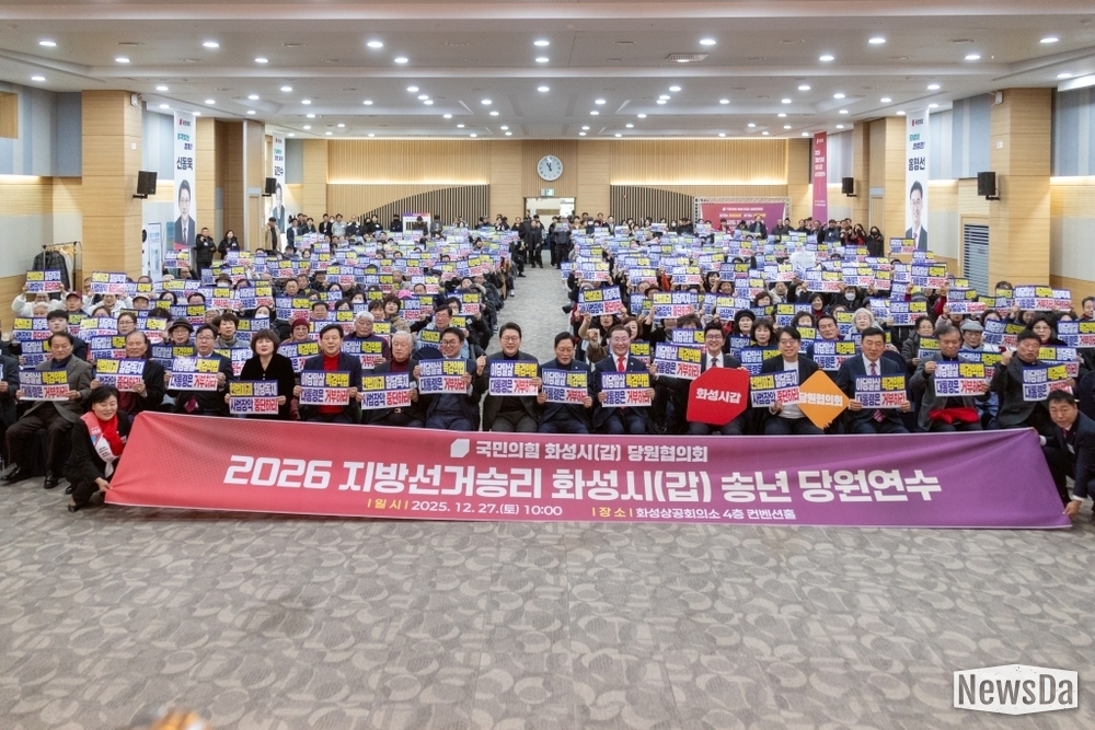 국민의힘 화성시갑 당원협의회는 27일 화성상공회의소에서 송년당원교육을 개최하며 조기 공천을 포함한 개혁적 공천을 통해 지방선거에서의 승리를 다짐했다. 이날 행사에는 1,000여 명의 당원이 참석해 주말 강추위 속에서도 강한 결집력을 보여주었다.