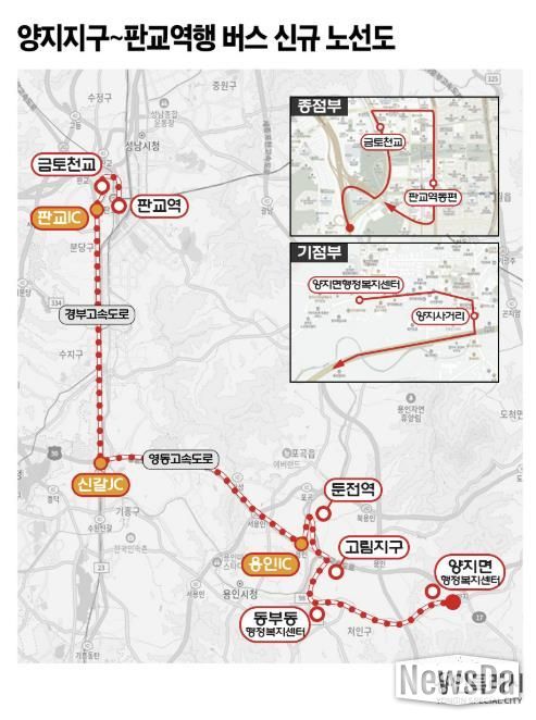 뉴스다 최광묵 기자 | 용인 양지지구를 출발해 고림동과 둔전역을 거쳐 성남 판교역까지 운행하는 버스 노선이 확정됐다.