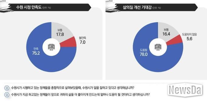뉴스다 최광묵 기자 | 수원시민 4명 중 3명은 “수원시가 일을 잘하고 있다”고 생각하는 것으로 나타났다. 시민 일상과 밀접한 생활밀착형 정책이 시정 만족도를 높이고 있는 것으로 보인다.