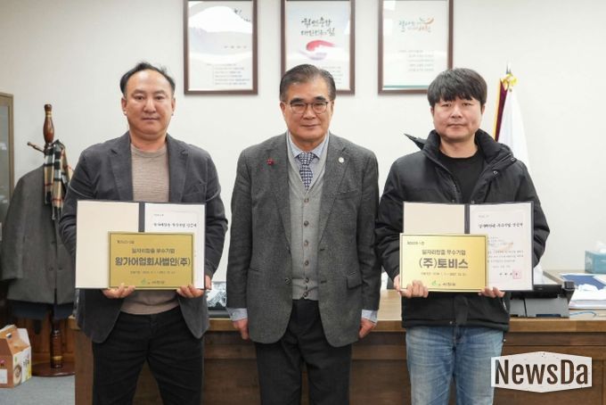 뉴스다 최광묵 기자 | 서천군은 지난 26일 고용 확대와 일자리 창출에 기여한 관내 우수기업 2곳을 ‘일자리창출 우수기업’으로 선정하고 인증서와 현판을 수여했다.